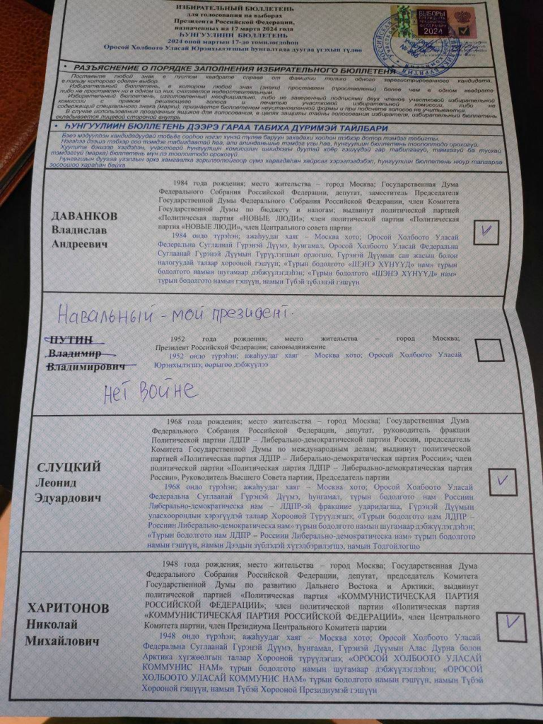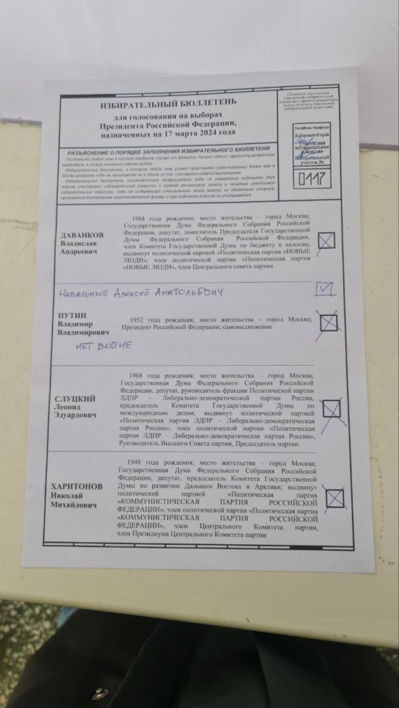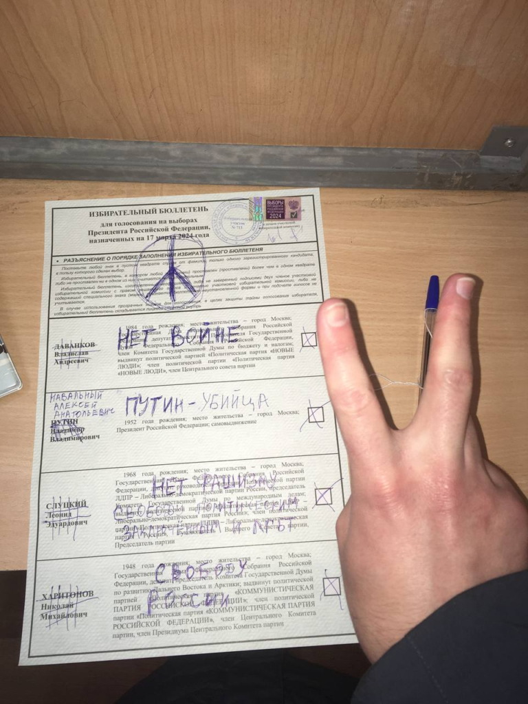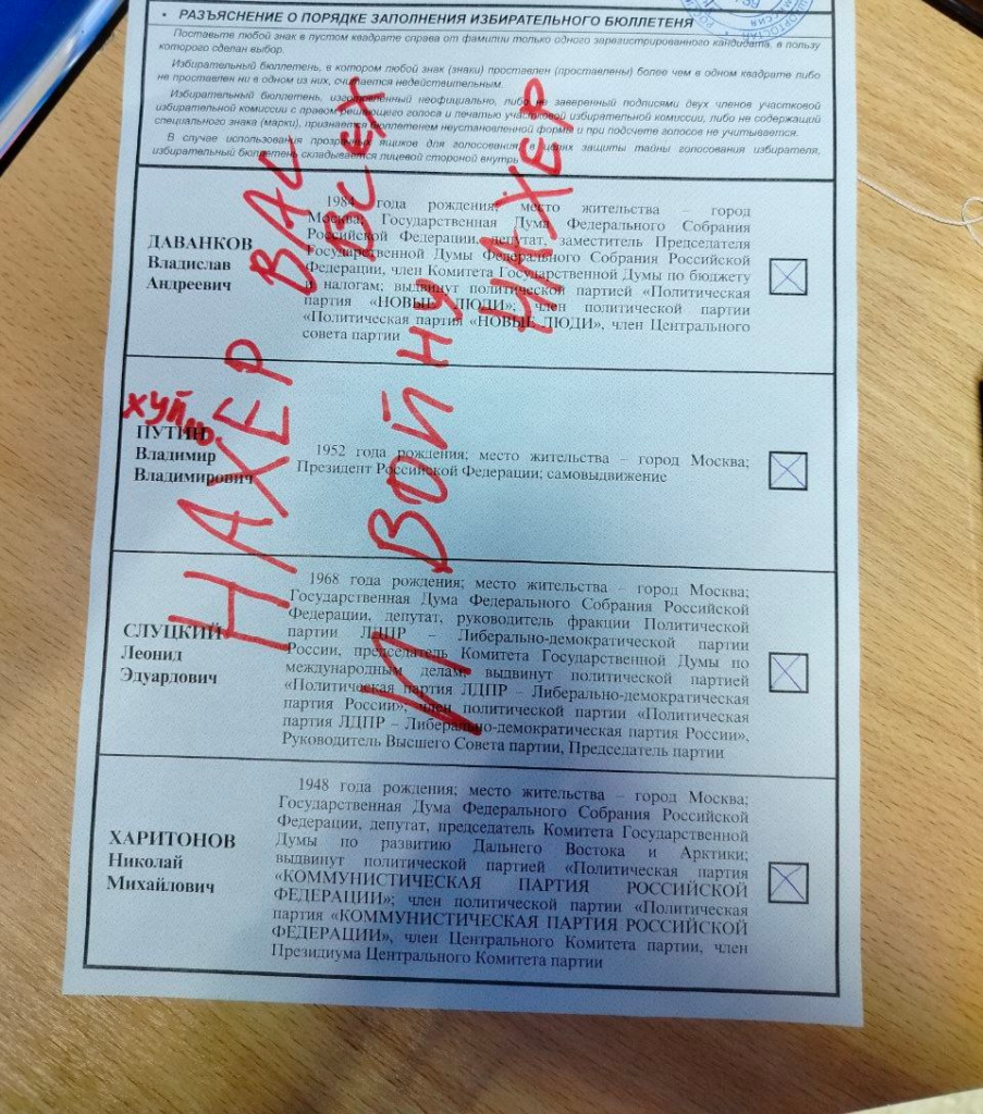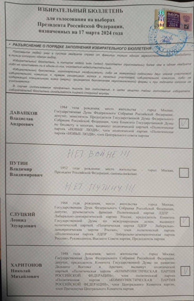 Ecco le fotografie di alcune delle numerosissime schede elettorali con scritte contro la guerra con cui gli elettori hanno espresso il loro dissenso alle “elezioni” presidenziali del 15-17 marzo in Russia: