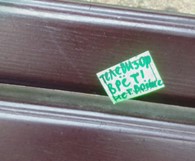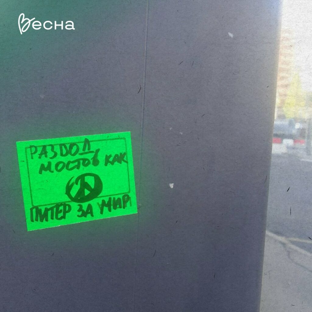 Sticker contro la guerra: “Combatti!”, “I ponti levatoi si alzano come il simbolo della pace. Piter (nome colloquiale della città) è per la pace”.