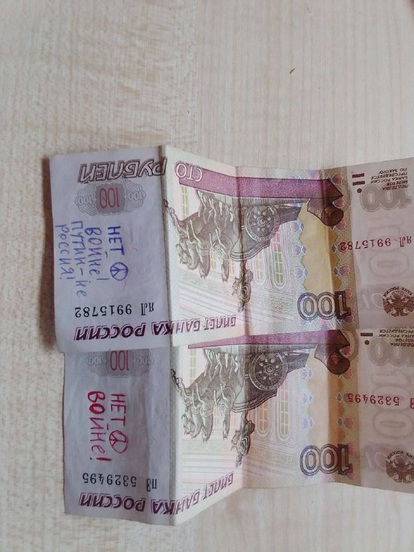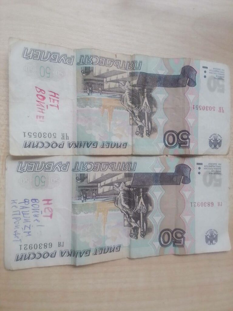 Su alcune banconote emesse da un bancomat si sono trovate le seguenti scritte contro la guerra: “No alla guerra!”, “Il fascismo non passerà!” (“fašism”, fascismo, è scritto con la lettera latina Z, simbolo della propaganda ufficiale in favore della guerra), “Putin non è la Russia”.