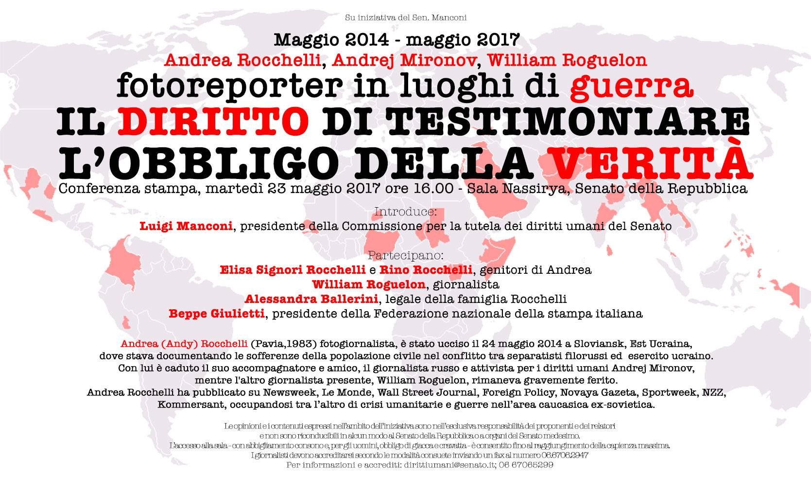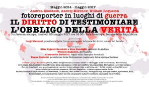 Per ricordarlo e ribadire la richiesta di verità e giustizia avanzata dalla famiglia, martedì 23 maggio, alle 16, in sala Caduti di Nassirya al Senato della Repubblica, il senatore Luigi Manconi, presidente della Commissione Diritti Umani, ha promosso una conferenza stampa dal titolo “Andrea Rocchelli, Andrey Mironov, William Roguelon: fotoreporter in luoghi di guerra. Il diritto di testimoniare. L’obbligo della verità”. Partecipano i genitori di Andrea, Elisa e Rino Rocchelli, l’avvocato della famiglia Alessandra Ballerini, il presidente della Federazione nazionale della stampa Beppe Giulietti e il giornalista francese William Roguelon, che viaggiava sull’auto con Rocchelli e Mironov bersagliata da colpi di mortaio lungo la strada per Slaviansk.