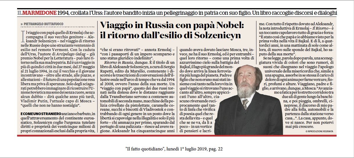 Il fatto quotidiano “Viaggio in Russia con papà Nobel: il ritorno dall’esilio di Solzenicyn”