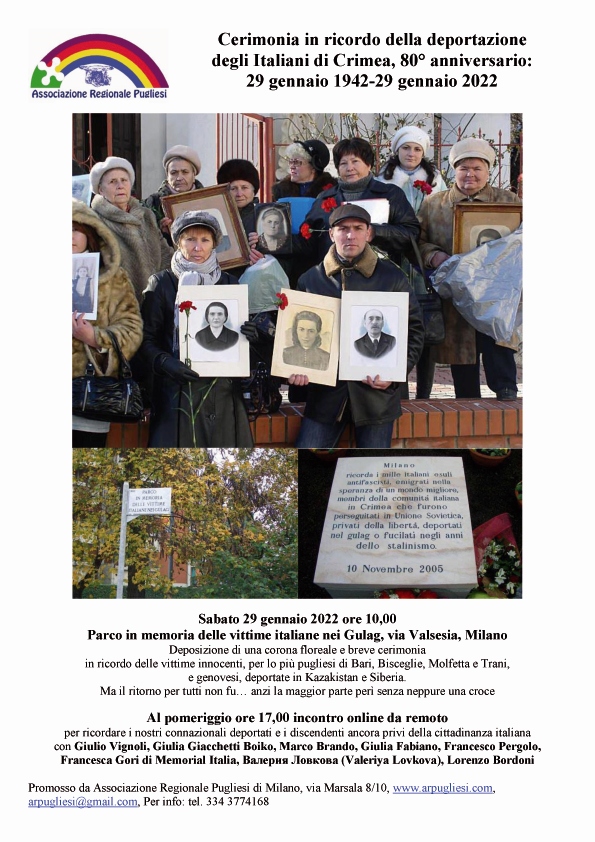 Sabato 29 gennaio 2022 ore 10,00 al “Parco in memoria delle vittime italiane nei Gulag”, in via Valsesia a Milano si svolgerà la cerimonia di commemorazione dell’80° anniversario della deportazione degli Italiani di Crimea. Si deporrà una corona floreale e si svolgerà una breve cerimonia in ricordo delle vittime innocenti, gli italiani di Crimea, per lo più pugliesi di Bari, Bisceglie, Molfetta e Trani, e genovesi, deportati in Kazachistan e Siberia. Ma il ritorno per tutti non fu… anzi la maggior parte perì senza neppure una croce. Il pomeriggio alle ore 17,00 avverrà l’incontro online, da remoto. per ricordare i nostri connazionali deportati e i discendenti ancora privi della cittadinanza italiana con Giulio Vignoli, storico, “scopritore” di questa comunità, Giulia Giacchetti Boiko, presidente del Circolo Il Cerchio di Kerč’ (Crimea), Giulia Fabiano, italiana di Crimea, Francesco Pergolo, parente di italiani in Crimea, Francesca Gori di Memorial Italia, Valerija Lovkova, autrice e regista del documentario “Frjazi. La nebbia trasfigurata” (così i russi chiamavano gli italiani di Crimea), 2017, Marco Brando e Lorenzo Bordoni, giornalisti. La commemorazione è promossa dalla Associazione Regionale Pugliesi di Milano.