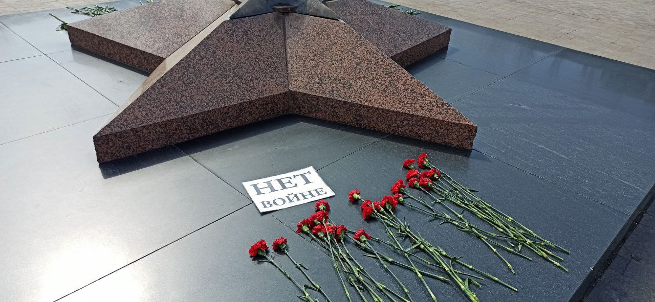 Nella Giornata della Vittoria alcuni cittadini di Kazan’ hanno deposto presso la Fiamma eterna dei garofani e un cartello con la scritta “No alla guerra”.