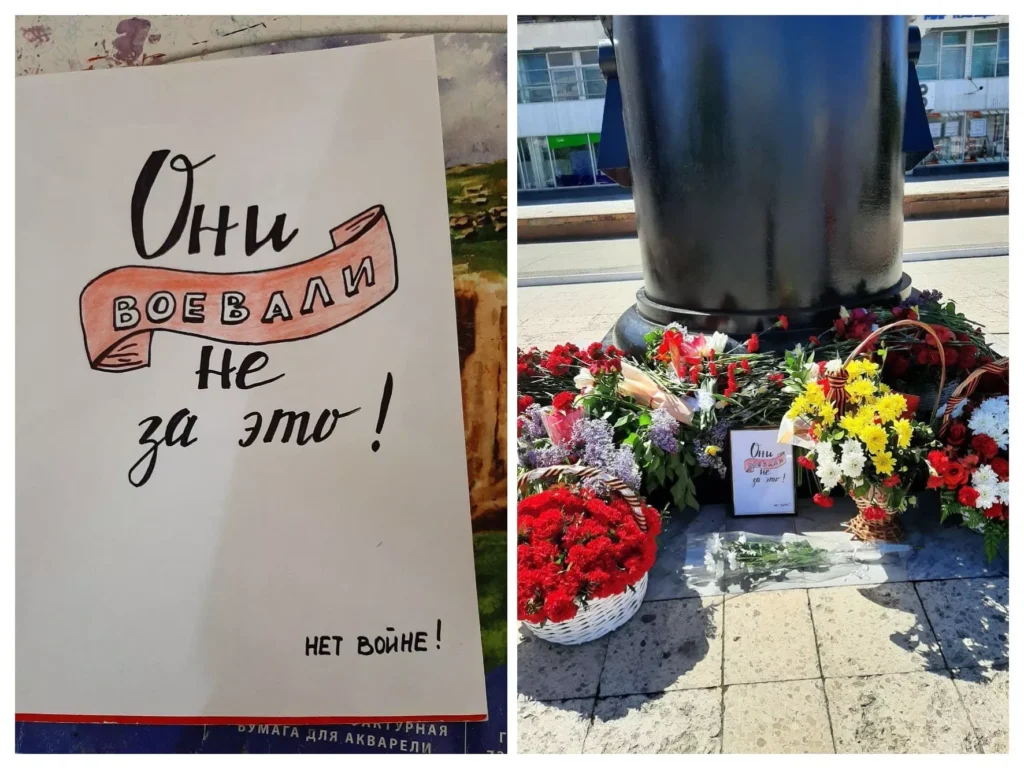 A Ul’janovsk, presso l’obelisco che celebra il 50° anniversario della Vittoria, è stata lasciata una cartolina con lo slogan “Loro non hanno combattuto per questo! No alla guerra!”