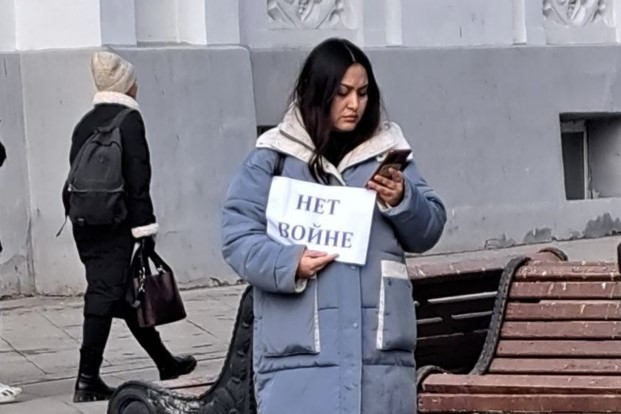 Nargiza Tochirova, all’ottavo mese di gravidanza, è stata trattenuta e portata alla stazione di polizia per aver tenuto un picchetto in via Nikol’skaja, nel centro di Mosca, con il cartello “No alla guerra”.