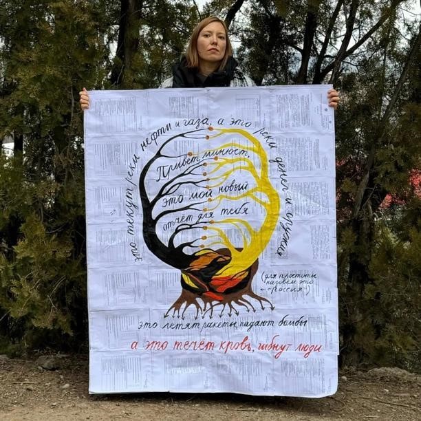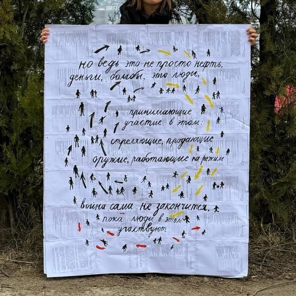 L’artista Dar’ja Apachončič ha pubblicato sulla sua pagina Facebook una nuova opera in cui ha rappresentato il ciclo dei soldi e della guerra nei suoi resoconti di agente straniero per il Ministero della Giustizia. “Buongiorno, Ministero della Giustizia, questo è il mio nuovo report per te. Qui c’è il flusso del petrolio e del gas e qui quello dei soldi e delle armi. Questi sono i razzi che volano, le bombe che cadono e qui scorre il sangue, muoiono le persone”. “Ma non si tratta solo di petrolio, soldi, bombe. Si tratta anche delle persone che vi prendono parte, che sparano, che vendono armi, che lavorano per il regime. La guerra non finirà da sola finché ci saranno delle persone che vi partecipano”.