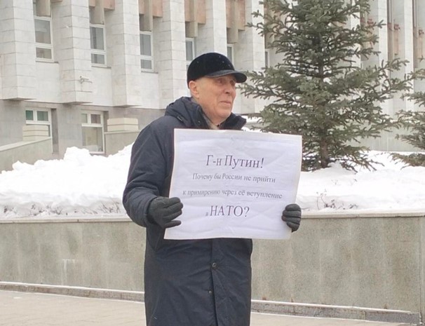 L’attivista settantottenne di Perm’ Viktor Gilin ha tenuto un picchetto col cartello: “Signor Putin, perché la Russia non arriva alla pacificazione entrando nella NATO?”