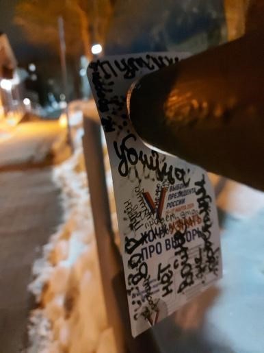 Slogan contro la guerra sui volantini di propaganda elettorale a Čeljabinsk.
