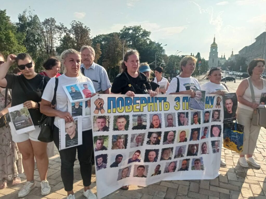 “Scriviamo allo Stato maggiore, al Ministero per la reintegrazione, ai nostri deputati… Ci siamo rivolti a Kyrylo Budanov [capo dell’intelligence del Ministero della difesa ucraino – N.d.T.]. Le proviamo davvero tutte… Abbiamo anche organizzato un evento nel parco Ševčenko. Abbiamo anche avuto modo di parlare a tu per tu con Lubinec’ [responsabile per i diritti umani presso la Rada – N.d.T.]. Ogni donna vuole che il suo compagno torni presto, ogni madre non vede l’ora che il figlio ricompaia. I nostri figli vogliono rivedere i padri. Una donna della nostra associazione si è addirittura inginocchiata, davanti a certe autorità. È tutta gente che ha contatti a livello internazionale. Vogliamo che si rendano conto di quanto soffriamo e della perdita che abbiamo subito” – spiega Ol’ha Manuchina.