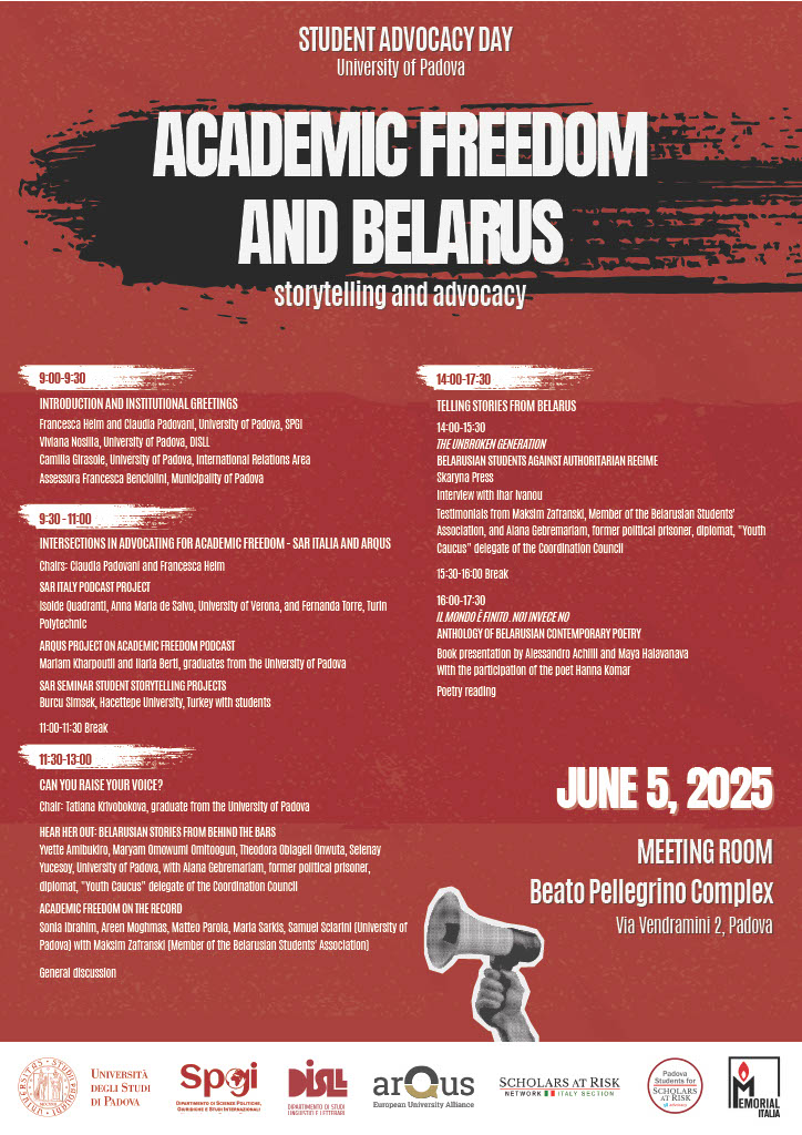 Si tiene giovedì 5 giugno 2025 dalle 9:00 alle 17:30 presso il Complesso Beato Pellegrino (via E. Vendramini 2) dell’Università degli Studi di Padova lo Student Advocacy Day, quest’anno dedicato alla situazione della libertà accademica in Belarus.