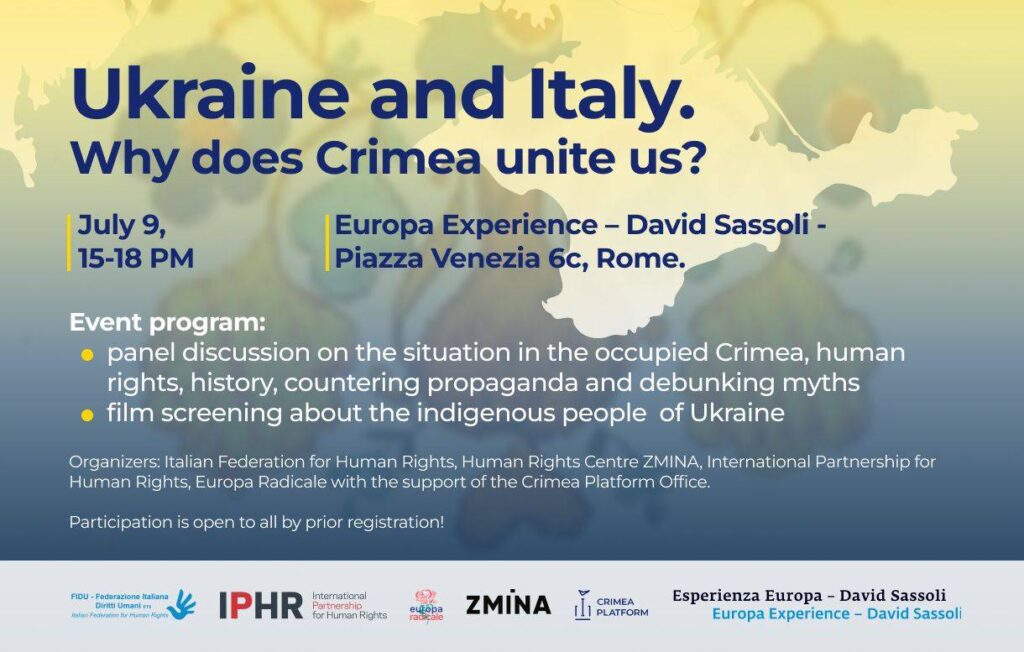A Roma mercoledì 9 luglio alle 15:00 presso Europa Experience David Sassoli FIDU Federazione Italiana Diritti Umani, come Memorial Italia partner della campagna People First, Human Rights Centre ZMINA, IPHR International Partnership for Human Rights e Europa Radicale con il sostegno di Crimea Platform Office presentano l’incontro Ukraine and Italy. Why does Crimea unite us?