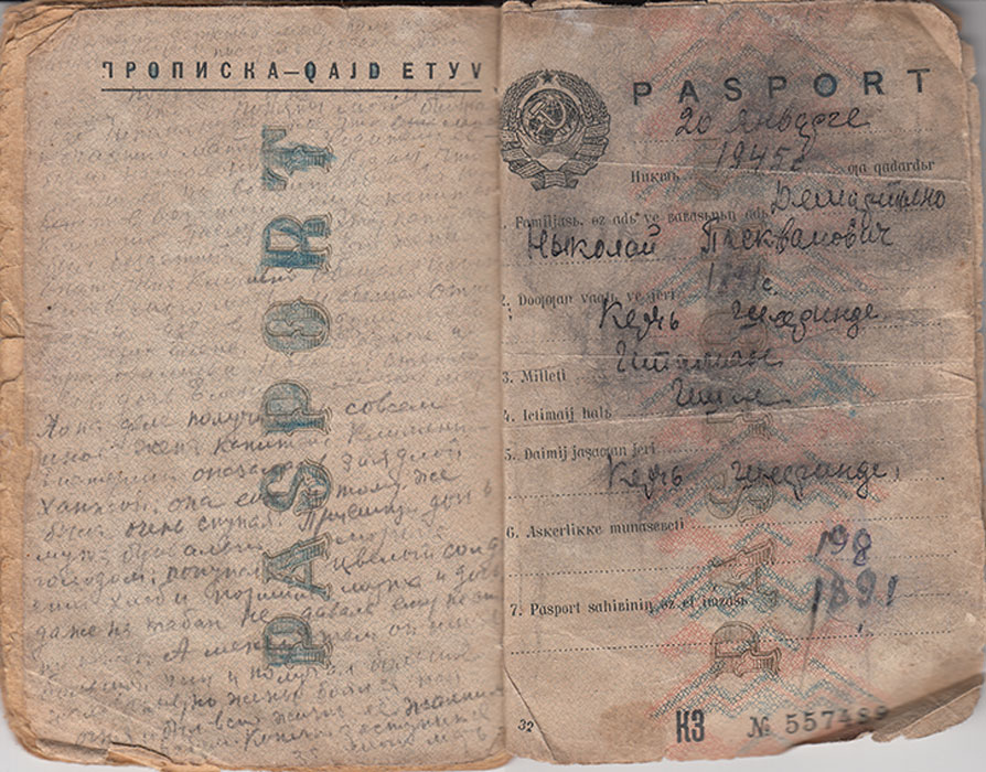 Nel 1936 la casa ha subito un notevole ridimensionamento, è rimasto soltanto un piccolo cortile e il giardino antistante. Nel 1937 il padre è stato arrestato con l’accusa di attività antisovietica. Daria Aleskandrovna è riuscita a far rilasciare il marito dopo tre mesi. Allo scoppio la guerra, Kerč’ è stata bombardata pesantemente e la famiglia De Martino, come la maggior parte degli abitanti di Kerč’, si è rifugiata nelle catacombe di Bulganaksk. Dopo l’occupazione della città da parte dei tedeschi si è presentata la possibilità di andare in Italia. Nikolaj Paskvalovič ha fatto un tentativo ma non ha voluto che suoi famigliari viaggiassero per mare sotto incessanti bombardamenti. Per il compleanno di Anatolij c’era sempre qualche ospite, ma il 28 gennaio del 1942 la festa è stata interrotta e nel giro di un’ora la famiglia è stata portata a Kamyš-Burun e caricata sulle chiatte insieme ad altri italiani. Una delle chiatte è stata affondata durante i bombardamenti. Da Novorossijsk sono giunti a bordo di un treno merci a Baku, dove hanno potuto mangiare per la prima volta. Da Baku sono andati via mare a Krasnovodsk e da lì in Kazachstan in treno. È stato un viaggio duro, la gente moriva all’interno dei vagoni. La storia della comunista italiana Maria Spartak, sfuggita al regime di Mussolini: è impazzita dopo che una guardia ha portato via suo figlio dal vagone senza fornire spiegazioni. Sono arrivati ad Atbasar all’inizio di marzo, c’erano forti gelate e non avevano vestiti adatti. Poi hanno raggiunto in slitta il villaggio “Pervoe maja”, nel kolchoz “Krasnaja poljana”. Li hanno sistemati nelle baracche. Presto Nikolaj Kroče si è ammalato ed è morto. Anton Paskvalovič è stato arruolato nell’esercito del lavoro a Karaganda, dov’è morto. Sua figlia Valja è morta di fame. Erano disperati. Una donna è arrivata a rubare nella speranza che l’arrestassero e i figli fossero affidati a un orfanotrofio, dove avrebbero dato loro da mangiare. L’hanno picchiata violentemente. Il padre lavorava come addetto al trasporto dell’acqua nel kolchoz. Nel giugno del 1943 il sorvegliante l’ha malmenato e dopo qualche giorno è morto in ospedale. Daria Aleksandrovna e Nina Paskvalovna si sono trasferite in una fucina abbandonata. Nell’inverno 1943-44 c’è stata una grave carestia e i bambini sono diventati gonfi. Nina Paskvalovna ha proposto di ricorrere al monossido di carbonio per risparmiare a tutti altre sofferenze. Inaspettatamente uno sconosciuto, impressionato nel vedere in quale situazione si trovassero, li ha aiutati regalando loro un sacco di grano. In primavera Anatolij e la mamma andavano a chiedere l’elemosina e lavorando nel kolchoz hanno iniziato a guadagnare qualcosa. I bambini raccoglievano tutto ciò che era commestibile. Anatolij è stato picchiato violentemente dal guardiano di un campo di patate, un reduce; la mamma è riuscita a stento a strappargli il figlio dalle mani. Nel 1945 Nina Paskvalovna e sua figlia Anja sono morte di tifo e nel 1946 Daria Aleksandrovna si è trasferita con i figli ad Atbasar, dove Anatolij ha iniziato a frequentare la prima classe quando aveva ormai quasi 10 anni. Nina è riuscita a trovare un impiego presso l’ufficio postale della stazione di Atbasar, poi ha lavorato come bambinaia nella famiglia di un ‘funzionario’ che l’ha aiutata a cambiare il cognome dei suoi figli in Černjavskij, registrandoli come cittadini russi. Ad Altbasar c’erano molti ceceni e ingusci deportati. Hanno fatto passare Anatolij come inguscio o ebreo. La mamma gli aveva raccomandato di non ammettere in nessun caso di essere italiano e lui ha mantenuto il segreto fino all’inizio degli anni 2000.