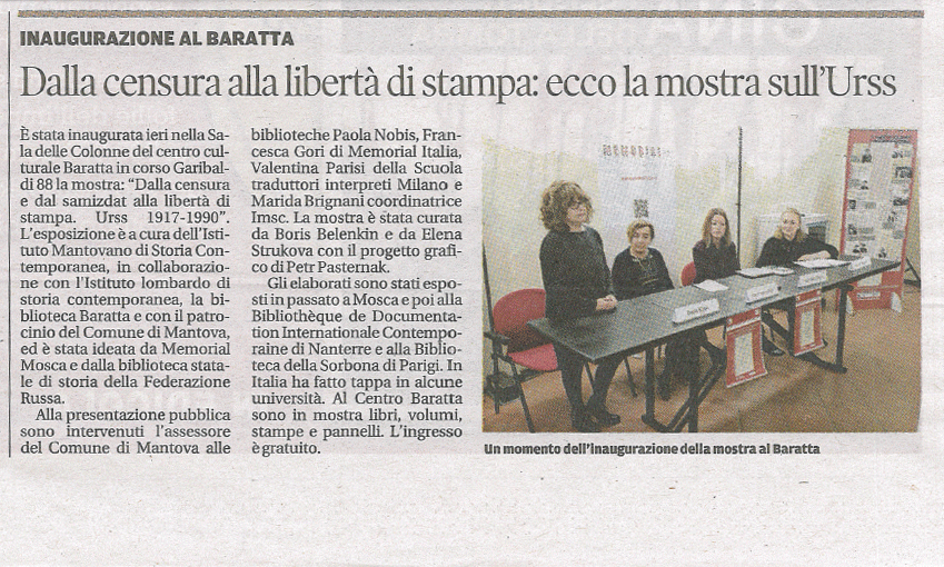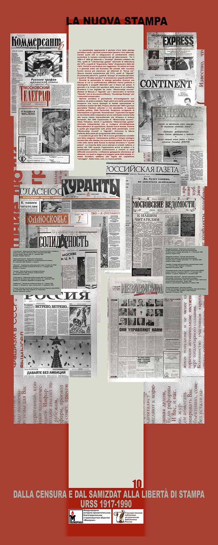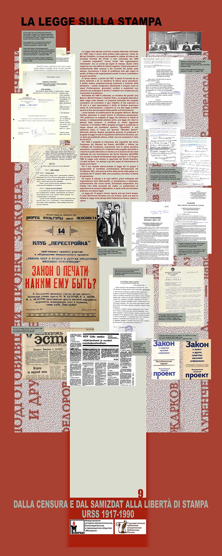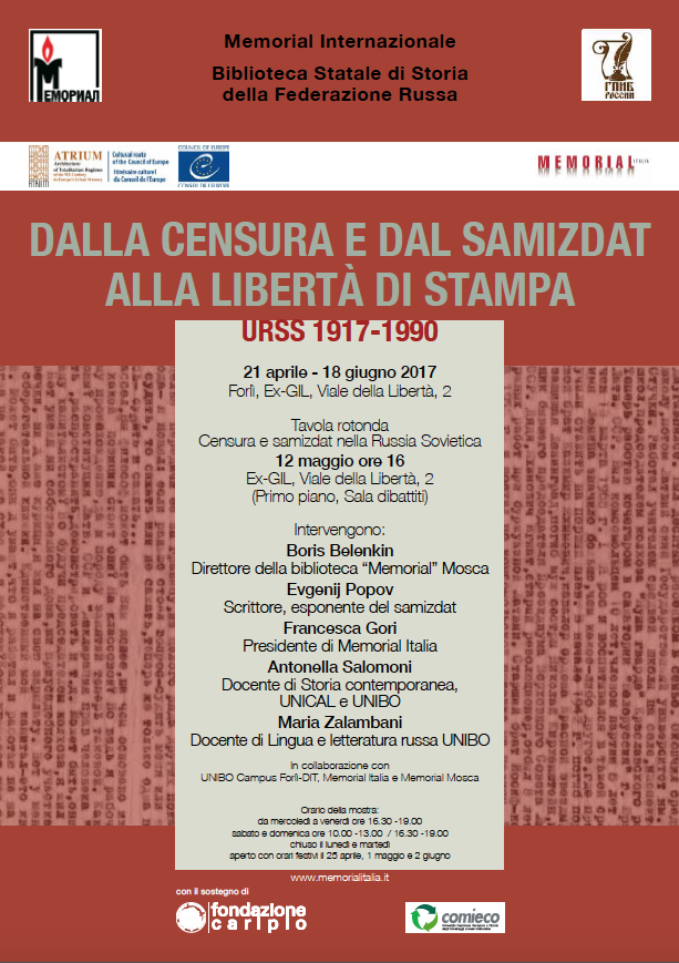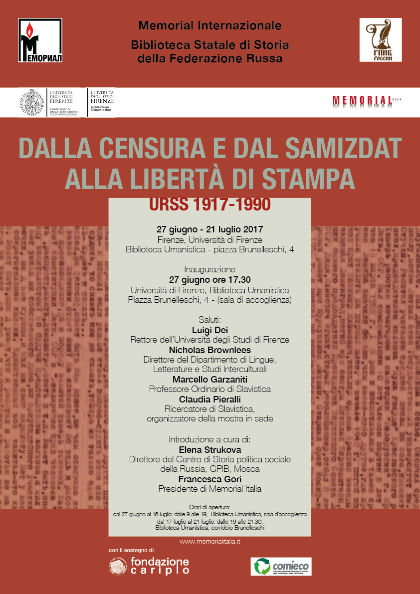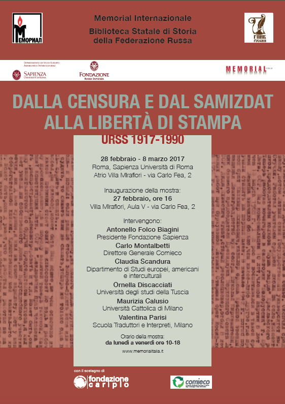 Dall’impegno congiunto degli studiosi russi di Memorial Internazionale e della Biblioteca Statale di Storia della Federazione Russa è nata la Mostra Dalla censura e dal samizdat alla libertà di stampa. URSS 1917-1990. Inaugurata a Mosca e poi presentata alla Bibliothèque de Documentation Contemporaine di Nanterre e alla Biblioteca della Sorbona, l’esposizione, itinerante, è giunta ora nel nostro paese, a cura di Memorial-Italia. Memorial ne propone il catalogo in versione digitale, integrandolo con alcuni contributi di studiosi russi e italiani del settore. La qualità e ricchezza dei pannelli della mostra danno adeguato risalto ai protagonisti, alle loro ragioni e azioni e documenti. È la narrazione in presa diretta del risveglio morale e sociale di un grande paese imbavagliato, che ritrovò allora coscienza e voce; la perestrojka, e poi la svolta del 1989-1991 devono molto agli eroi di questa fervida stagione.