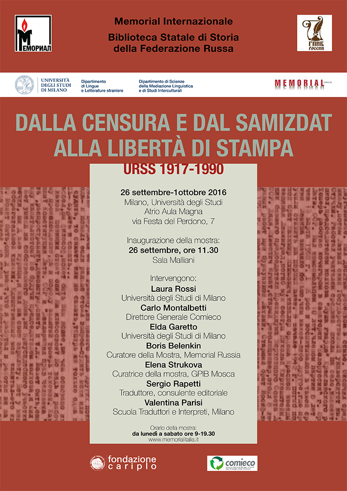 La mostra è organizzata dall’Università di Milano (Dipartimento di Lingue e Letterature straniere e Dipartimento di Scienze della Mediazione linguistica e di Studi interculturali) e da Memorial Italia con il contributo di Comieco e il sostegno della Fondazione Cariplo.