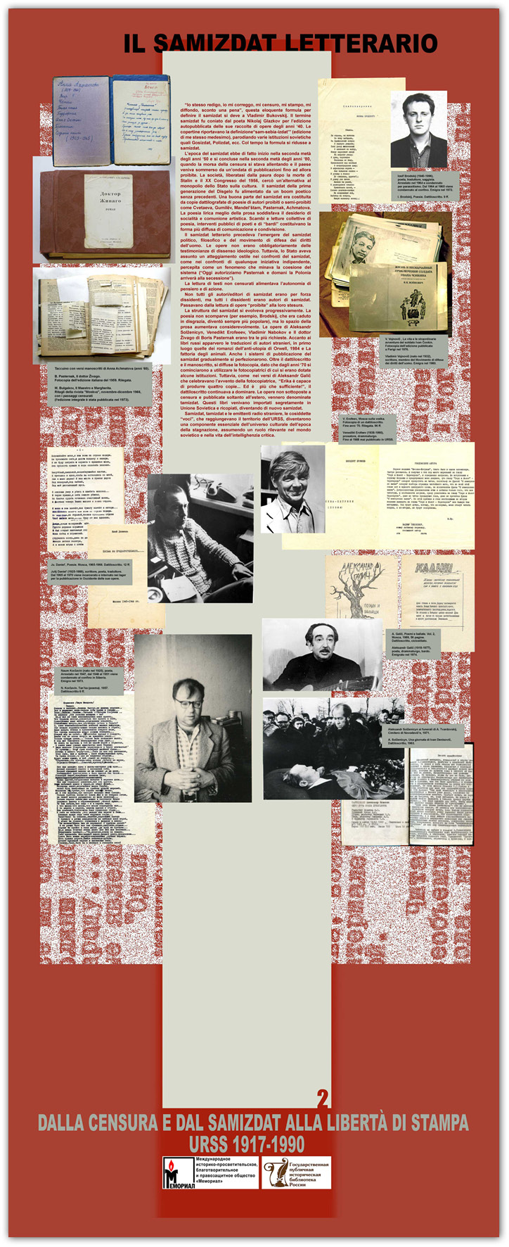La mostra, organizzata da Memorial Mosca e dalla Biblioteca Statale di Storia della Federazione Russa, a cura di Boris Belenkin e di Elena Strukova, e il cui progetto grafico si deve a Pëtr Pasternak, presenta con inedita ricchezza di immagini i protagonisti e i documenti dell’opposizione al regime sovietico, dando ampio risalto figurativo a un fenomeno storico unico nel suo genere, il Samizdat, che costituì un canale di distribuzione clandestino e alternativo di scritti illegali, censurati o ostili al regime sovietico.